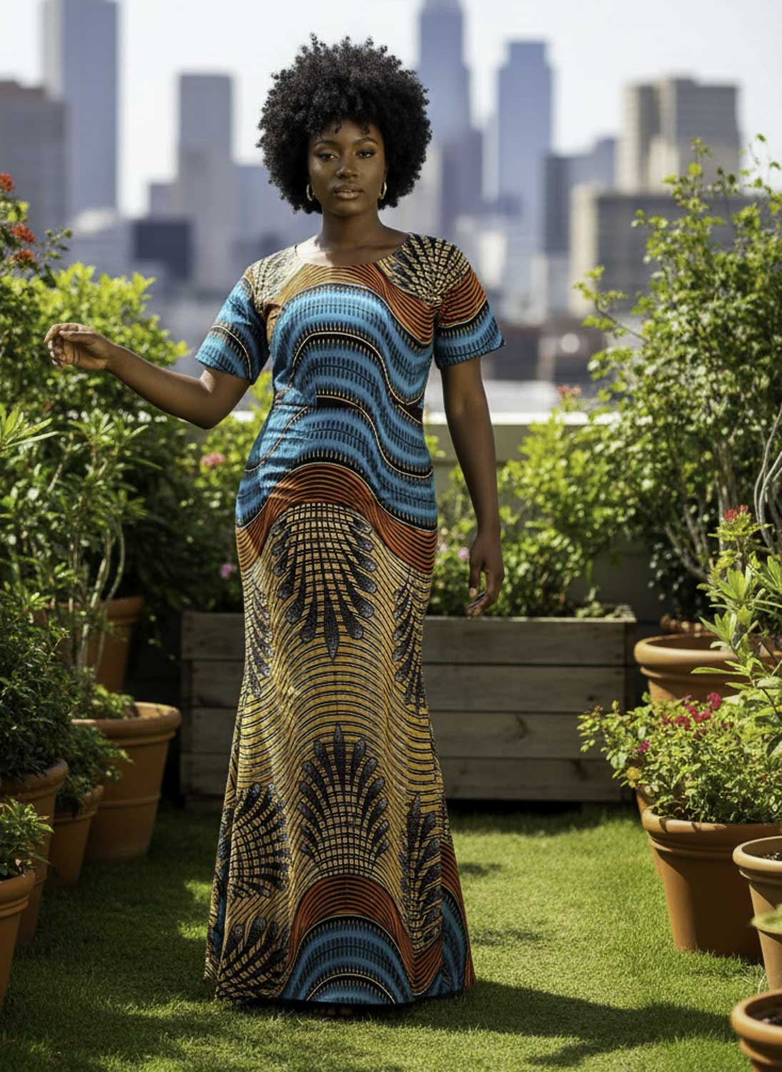 Sublimez vos courbes avec cette robe sirène en wax aux motifs dynamiques et colorés. Son design met en valeur la silhouette grâce à une coupe ajustée qui s’évase délicatement sur le bas.