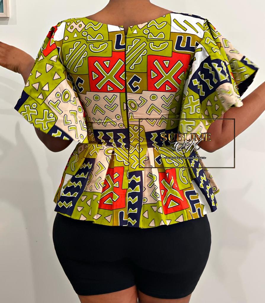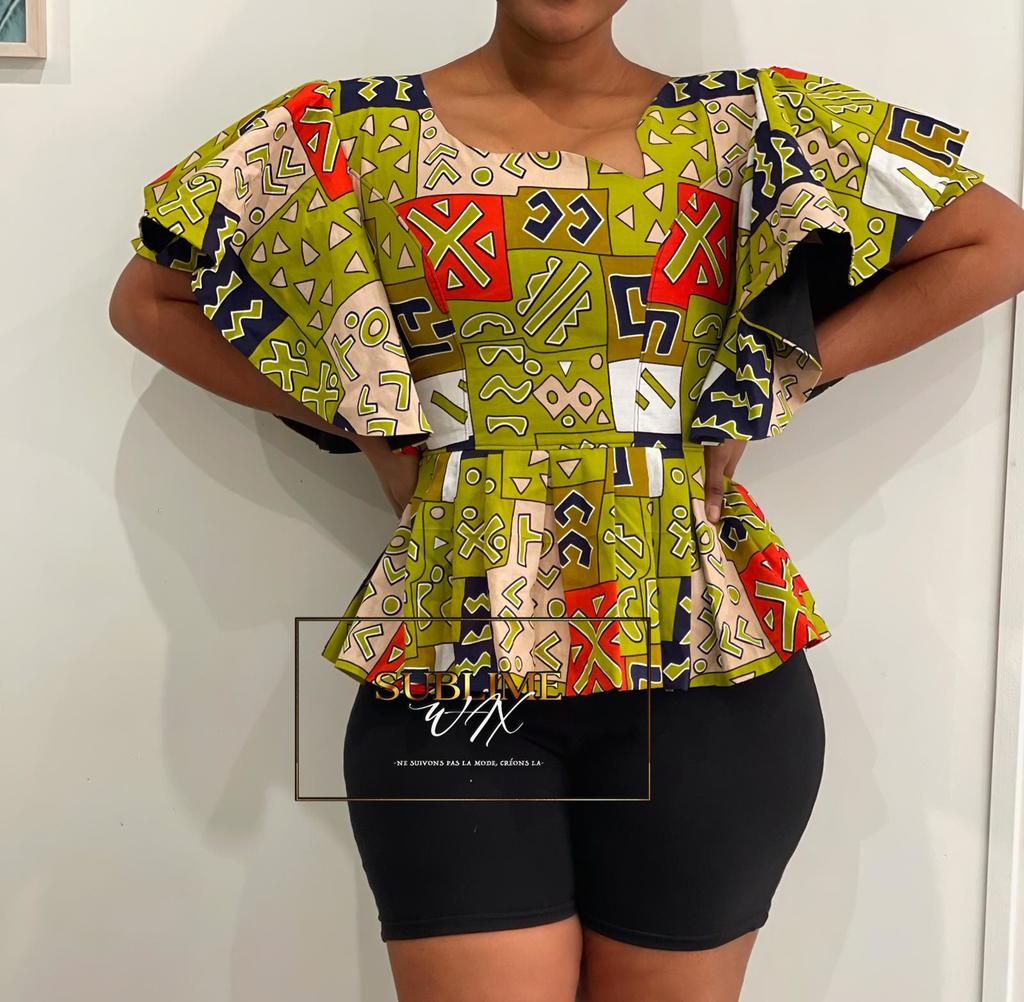 Apportez une touche de charme et de féminité à votre garde-robe avec ce haut en wax. Son design à basque souligne délicatement la taille, tandis que les manches courtes volantes offrent une allure légère et élégante. La fermeture éclair au dos garantit un ajustement parfait, et il est entièrement doublé pour un confort optimal.